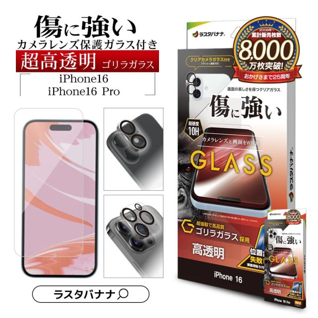 【送料無料】iPhone16 16 Pro ガラスフィルム 平面保護 高光沢 クリア ゴリラガラス採用 0.33mm 硬度10H 簡単貼り付け カメラレンズ保護ガラス付き アイフォン ラスタバナナ GCS4339IP461 GCS4412IP461P