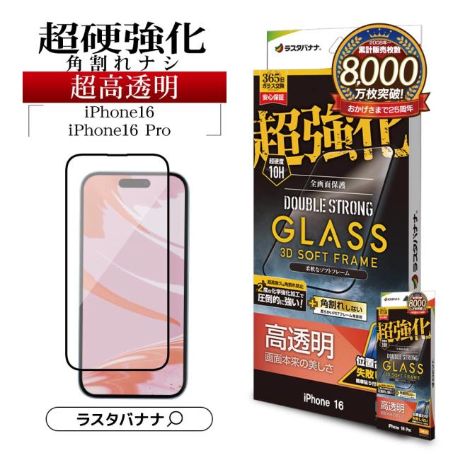 iPhone16 16 Pro iPhone15 ガラスフィルム 全面保護 高光沢 高透明 ダブルストロング 角割れしない 0.25mm ガイド枠付き ラスタバナナ