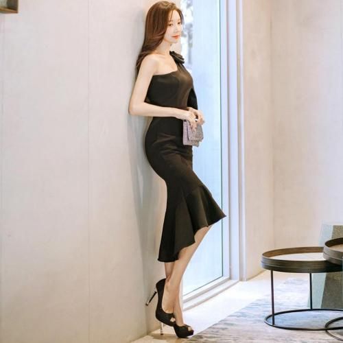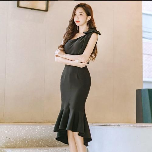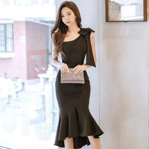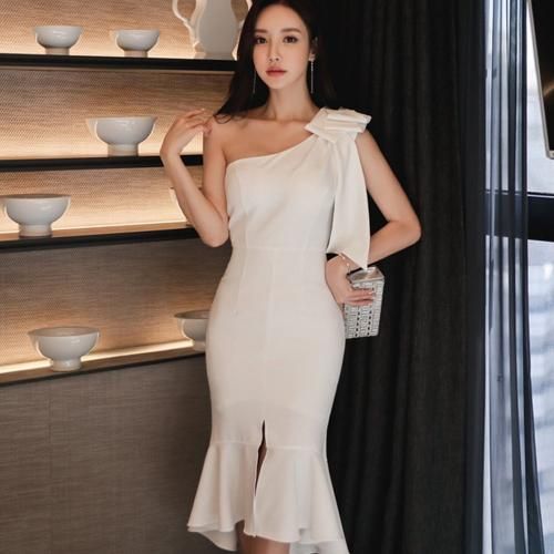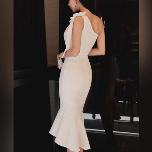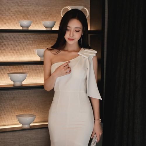 【グラシア】 キャバ ドレス キャバドレス ワンピース ミディアムドレス マーメイドライン ワンショルダー シルエット シンプル デコルテ リボン すっきり ドレッシー 大人 ブラック ホワイト S M L XL