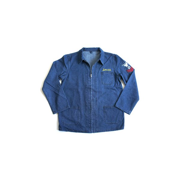 当製品は1960年代に日本でよく見かけたデニムのカバーオールをもとに製作しており、胸に刺繍、袖に内燃機関士の2等海曹階級章パッチを取り付けています。