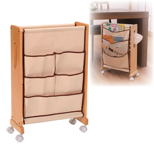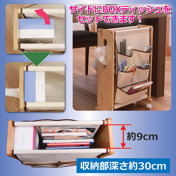 普段の生活では、新聞やテレビのリモコン、郵便物や広告チラシ、雑誌などなど、ついつい使い易いからと言ってテーブルの上に置きっぱなしになっていますよね。でも突然に来客があった時に、慌ててテーブルの上を片付けるのにドタバタしてしまいます。このワゴンは、テーブルの上を整理してテーブル下に入るように特別に設計されたものです。キャスターで自由に移動できるため、普段は手元に置いて、隠したい時にはサッとテーブル下にスベリ込ませることができます。片側に3つ、もう片側に5つの収納ポケットを装備し、中央部分には、少し大きいものが入るようになってます。その中央部分のサイドに、ティッシュBOXをセットしておくことができます。