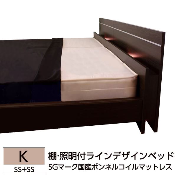 棚 照明付ラインデザインベッド K(SS+SS) SGマーク国産 日本製 国産ボンネルコイルマットレス付 茶 ダークブラウン こげ茶 ライト照明は手元で操作でき就寝前の読書に最適。 多様なサイズの組み合わせで利用可能な、光を放つベッドと棚が一体化した、ラインデザインのベッド 国内で製造されたSGマーク付きのボンネルコイルマットレスが付属し、ダークブラウンの色合いが高級感を演出
