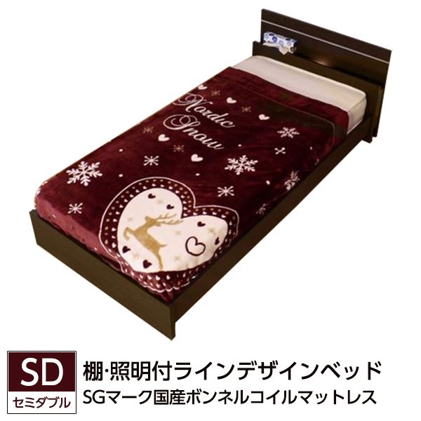 セミダブルベッド 茶色 ブラウン 茶 棚 照明付ラインデザインベッド SGマーク国産 日本製 国産ボンネルコイルマットレス付 茶 ダークブラウン こげ茶 送料無料