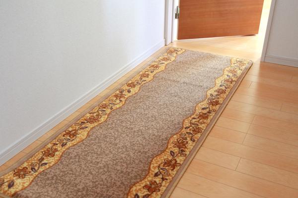 クラシカルな印象の上品な商品です。廊下敷きとしても、キッチンマットとしてもご使用頂けます。表地には丈夫で汚れにくいナイロンを使用しているため耐久性にも優れた商品です。裏面にはすべりにくい加工を施しています。
