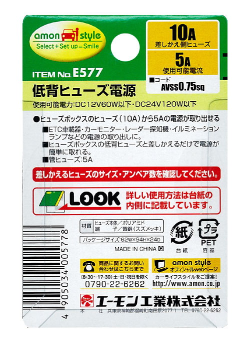 車の電源を手軽に取り出せる スリムなヒューズ電源 E577【まとめ買い お徳用 15セット】 車の電源を手軽に取り出せる スリムなヒューズ電源 E577【まとめ買い お徳用 15セット】■10Aヒューズから5Aまでの電源が取れる