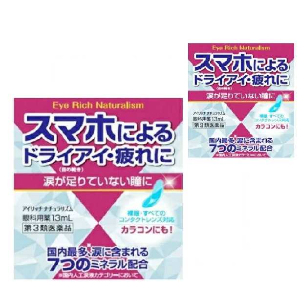 医薬品区分一般用医薬品薬効分類人工涙液承認販売名製品名アイリッチナチュラリズム製品名(読み)アイリッチナチュラリズム製品の特徴●添加物を最小限に●涙に近い成分●蒸発しにくくうるおい長続き●刺激を抑えたマイルドタイプ裸眼,すべてのコンタクトレンズに対応です。(カラーコンタクト含む)使用上の注意■相談すること1.次の人は使用前に医師,薬剤師又は登録販売者に相談してください。 (1)医師の治療を受けている人 (2)薬などによりアレルギー症状を起こしたことがある人 (3)次の症状のある人 はげしい目の痛み (4)次の診断を受けた人 緑内障2.使用後,次の症状があらわれた場合は副作用の可能性があるので,直ちに使用を中止し,この添付文書を持って医師,薬剤師又は登録販売者に相談してください。[関係部位:症状]皮膚:発疹・発赤,かゆみ目:充血,かゆみ,はれ3.次の場合は使用を中止し,この添付文書を持って医師,薬剤師又は登録販売者に相談してください。 (1)目のかすみが改善されない場合 (2)2週間位使用しても症状がよくならない場合効能・効果目の疲れ,涙液の補助(目のかわき),ハードコンタクトレンズ又はソフトコンタクトレンズを装着しているときの不快感,目のかすみ(目やにの多いときなど)効能関連注意用法・用量1回2〜3滴,1日3〜6回点眼してください。用法関連注意(1)小児に使用させる場合には,保護者の指導監督のもとに使用させてください。(2)容器の先が,まぶたやまつ毛などに触れると,目やにや雑菌などのため,薬液が汚染または混濁することがありますので注意してください。また,混濁したものは使用しないでください。(3)点眼用にのみ使用してください。成分分量100mL中成分分量塩化ナトリウム733mg塩化カリウム127mg塩化カルシウム水和物15mg硫酸マグネシウム水和物10mgリン酸水素ナトリウム水和物273mgL-アスパラギン酸カリウム120mgブドウ糖5mg添加物乾燥炭酸ナトリウム,エデト酸ナトリウム水和物,ベンザルコニウム塩化物液保管及び取扱い上の注意(1)直射日光の当たらない涼しいところに密栓して保管してください。特に車のダッシュボード等,高温下に放置すると,容器の変形や薬液の変化を生じるおそれがあります。(2)小児の手の届かない所に保管してください。(3)他の容器に入れ替えないでください(誤用の原因になったり,品質が変わることがあります)。(4)他の人と共用しないでください。(5)使用期限(外箱に記載)を過ぎた製品は使用しないでください。また,使用期限内であっても,開封後はできるだけ速やかに使用してください。(6)保存状態によっては,成分の結晶が容器の先やキャップの内側につくことがあります。その場合には,清潔なガーゼで軽くふきとってから使用してください。(7)コンタクトレンズ(カラーコンタクトレンズを含む)は,眼科医による処方,定期検査を受けて使用してください。消費者相談窓口会社名:佐賀製薬株式会社問い合わせ先:お客様相談窓口電話:0942-92-5656受付時間:午前9:00〜午後5:00(土・日・祝日を除く)製造販売会社佐賀製薬(株)会社名:佐賀製薬株式会社住所:〒841-0201 佐賀県三養基郡基山町小倉481剤形液剤リスク区分等第3類医薬品商品仕様シリーズ名 アイリッチナチュラリズムブランド名 佐賀製薬メーカー型番 841-0201原産国/製造国 日本効能・悩み・目的 ドライアイ、目の疲れ内服薬・外用薬 外用薬 内容量 13ml×2個セット