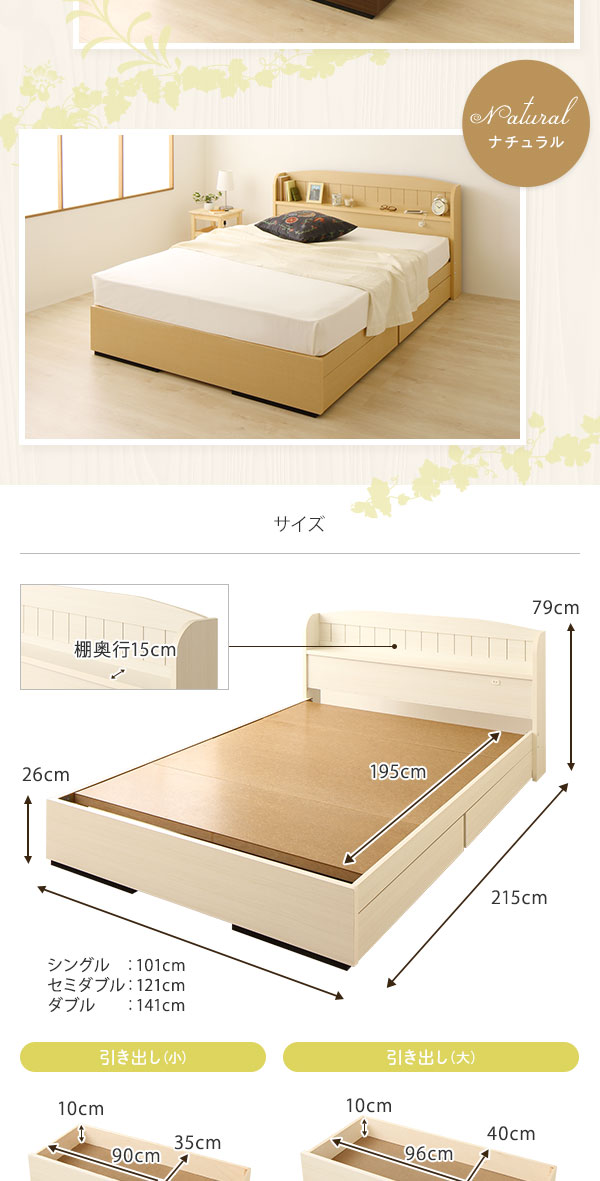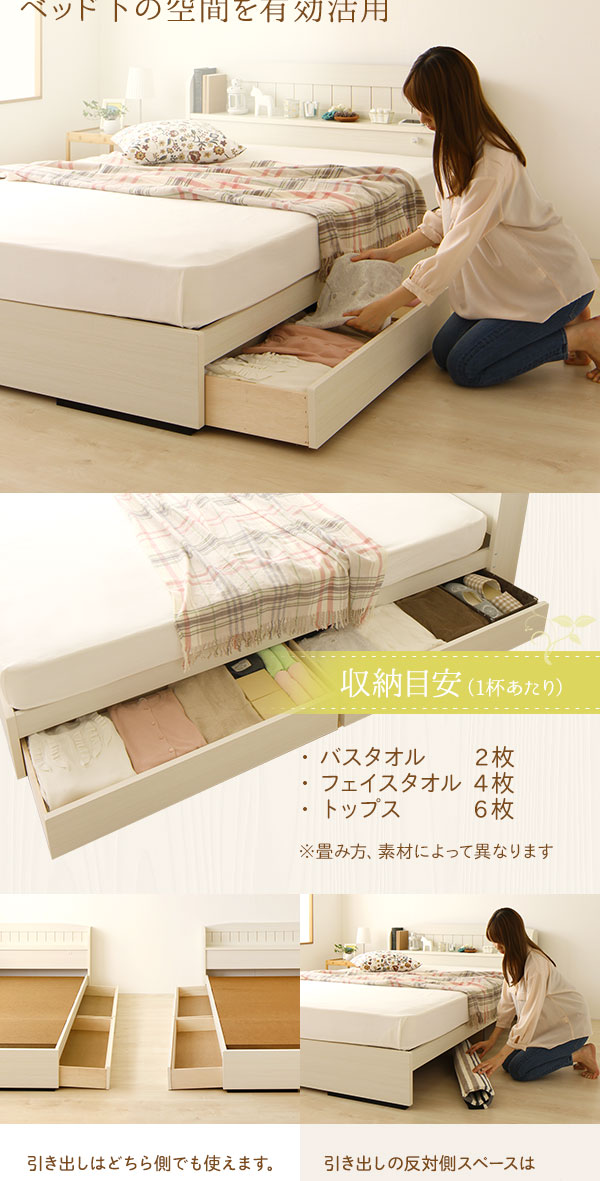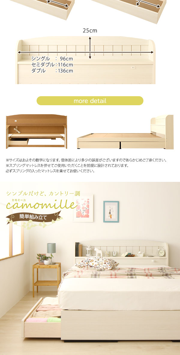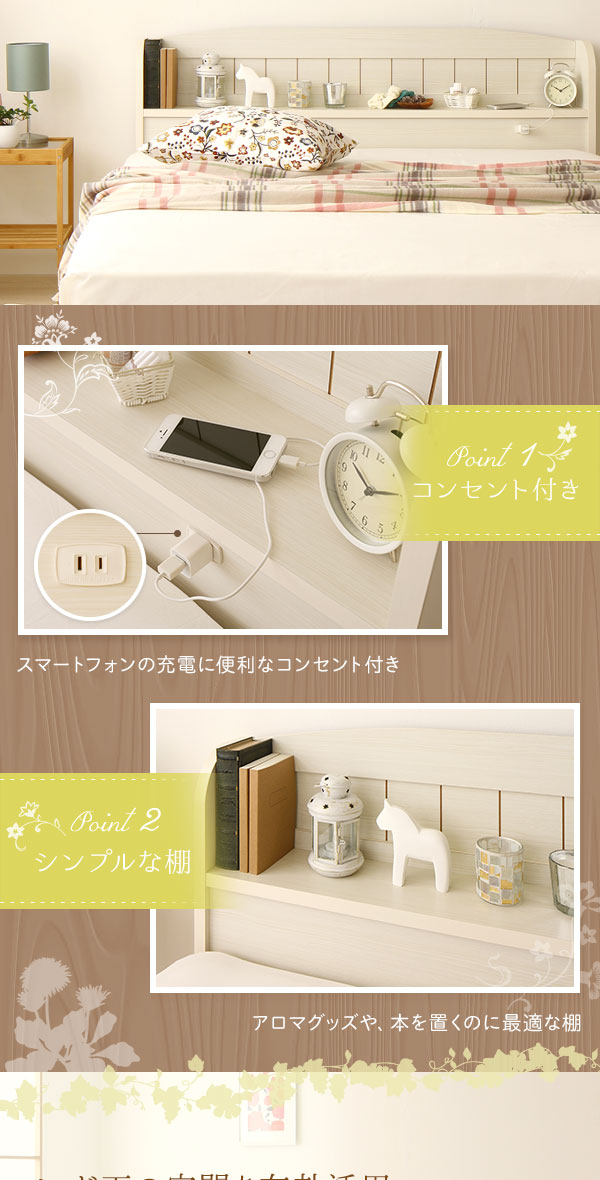 セミダブルベッド 白 ホワイト 宮付き コンセント 収納ベッド (ポケットコイルマットレス(両面仕様)付き) カントリー調 姫系 『カモミーユ』 白 ホワイト 白 コンセント付きで時計やフォトフレームの電源、携帯の充電に最適。 枕元のヘッドボードが時計や携帯、写真、フォトフレームなどの小物置き場に最適。電気スタンドやその他照明器具を置くご予定の場合はサイズの確認、及びコンセント付きである事をお確かめ下さい。 1人でゆったり余裕の広さが嬉しい。 愛されるフレンチカントリースタイルの宮付き (置き台 ヘッ