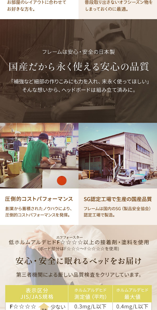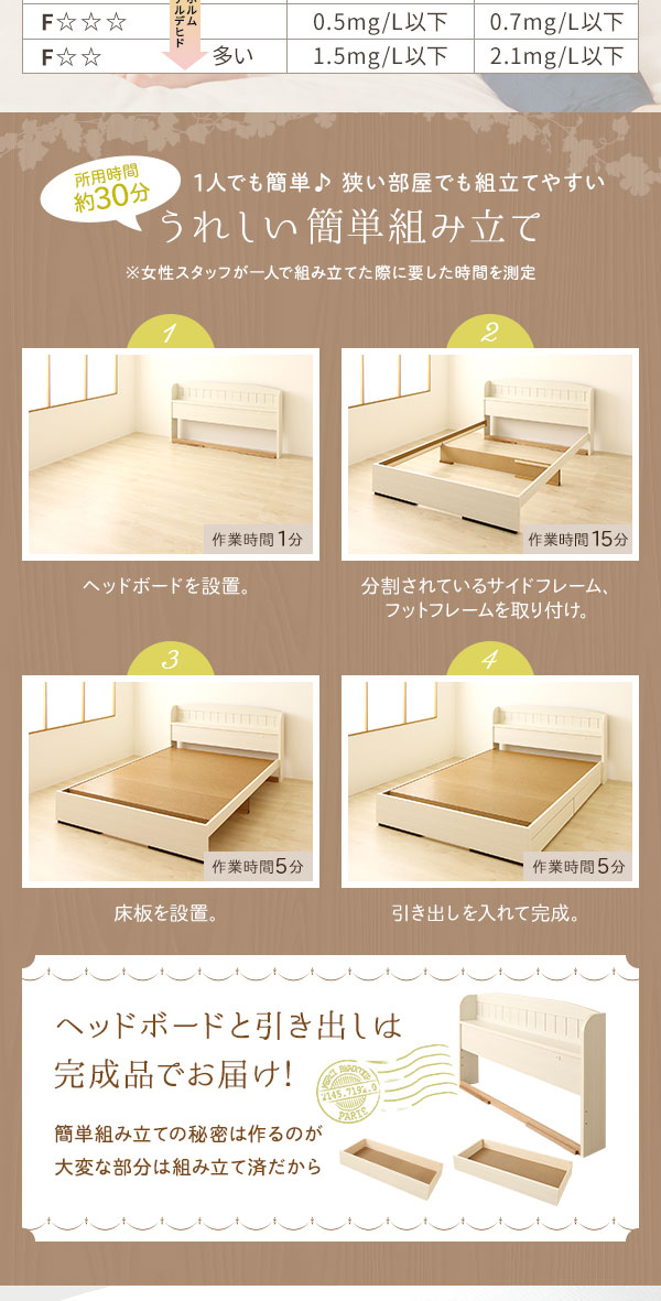 ヘッドボードと引き出しは国内工場で組み立て済みの完成品だから