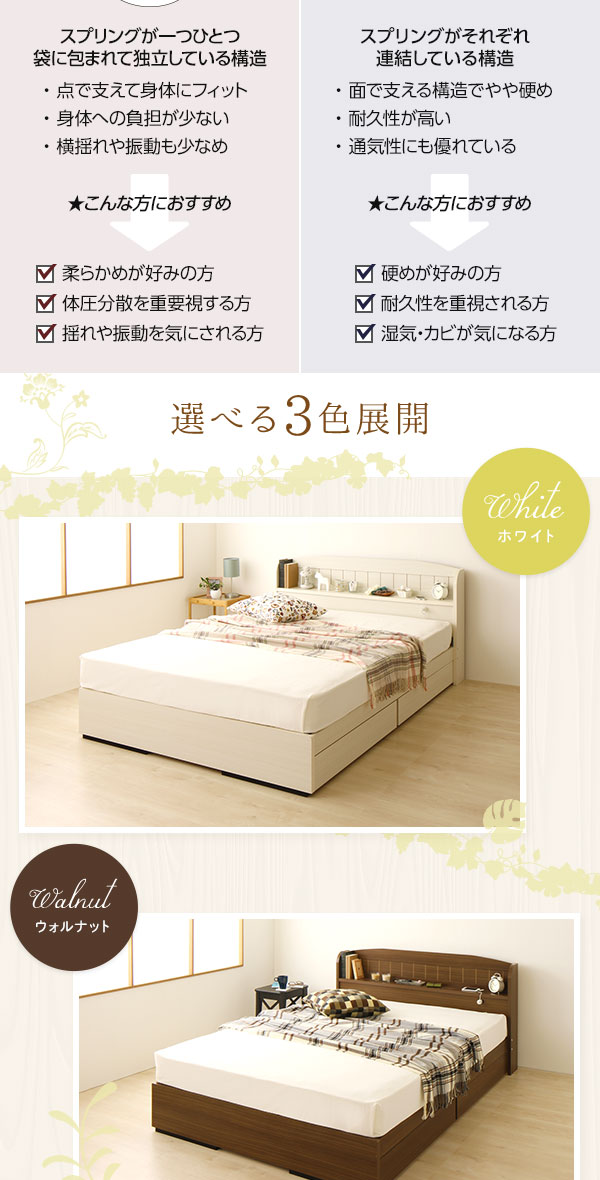 セミダブルベッド 白 ホワイト 宮付き コンセント 収納ベッド (ポケットコイルマットレス(両面仕様)付き) カントリー調 姫系 『カモミーユ』 白 ホワイト 白 送料無料