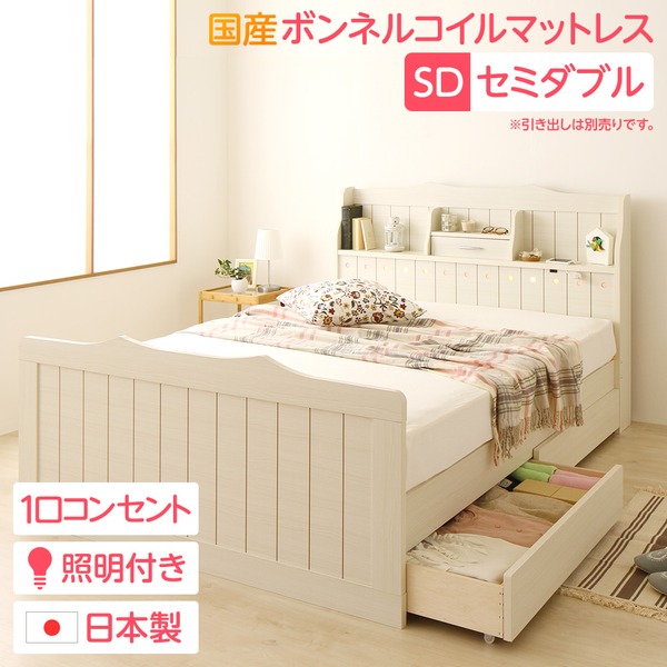 セミダブルベッド 白 ホワイト 【引き出し別売】 日本製 国産 カントリー調 姫系 ベッド (SGマーク国産 日本製 国産ボンネルコイルマットレス付き) 『エトワール』 白 ホワイト 白 宮付き 照明付き コンセント付き 送料無料