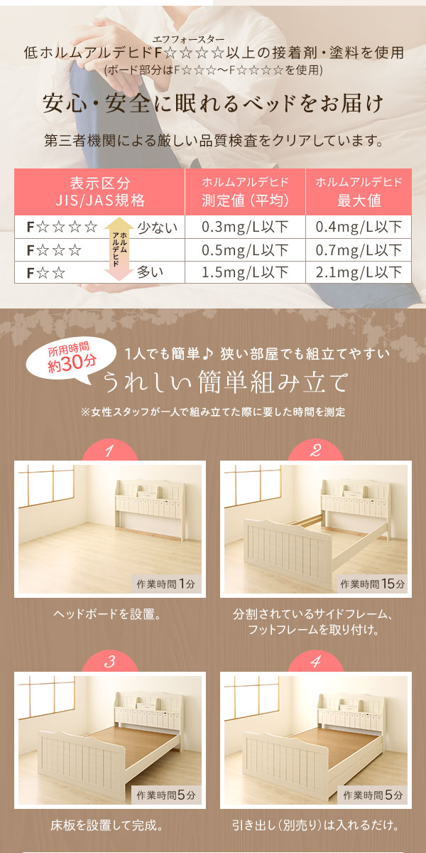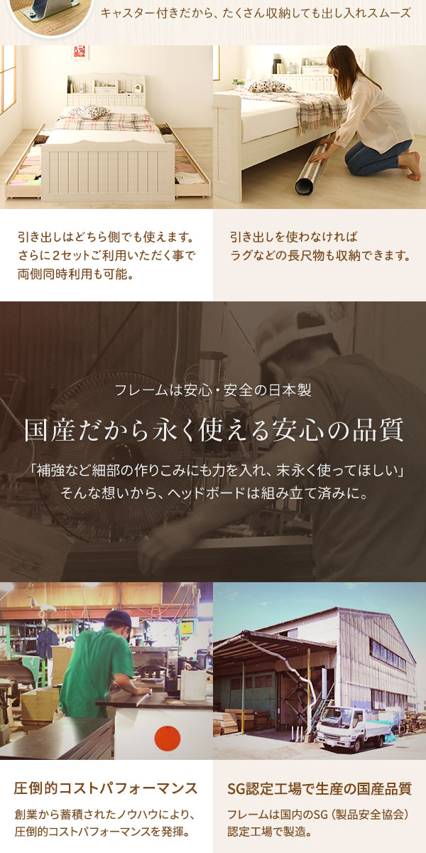 ヘッドボードと引き出しは国内工場で組み立て済みの完成品だから