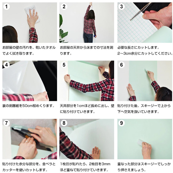 注2)凸凹、表面強化、布クロス、汚れ防止などの各種機能性壁紙(クロス)。砂壁、土壁、綿壁、漆喰壁、コンクリート、ペンキ面、ベニヤ板、木材、ホコリなどの付着物がある場合や薬品・洗剤を利用して清掃後の施工は剥がれる可能性が高く貼り付け不可。何度も貼って剥がしての繰り返し、直射日光が当たる、お部屋の環境(高温・低温・多湿)により剥がれたり、逆に付き過ぎる場合がございます。(夏場施工)お部屋に熱がこもっている場合はエアコン等で壁を冷ましてから施工を行って下さい。(冬場施工)5℃以下の場合は暖房などを入れ部屋の温度をあげてから施工を行って下さい。