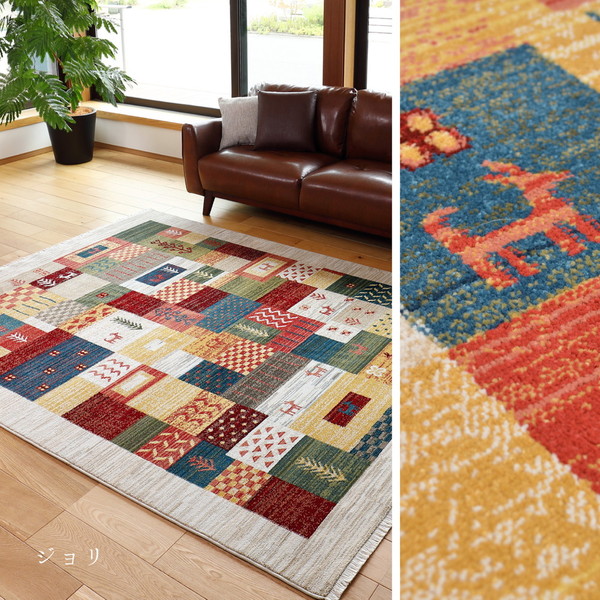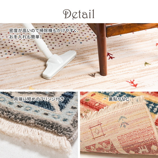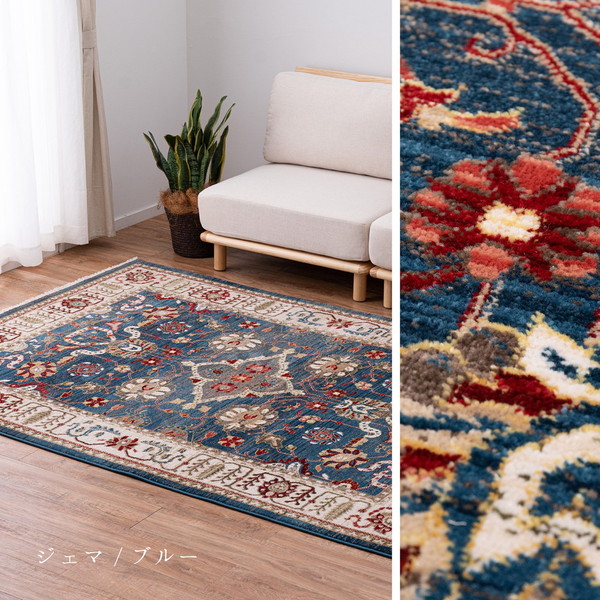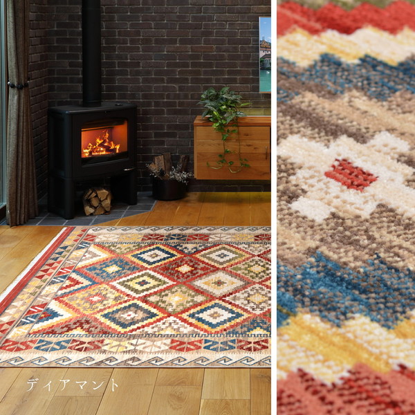 ラグの名産地トルコ製の1枚。民族調手織り絨毯の様なエスニックなデザインをウィルトン織機で織りあげました。毛足は1cm程ありますが、密度が高いので、掃除機もかけやすいようデザインされています。縦糸の特殊加工により折りたたんで収納出来ます。