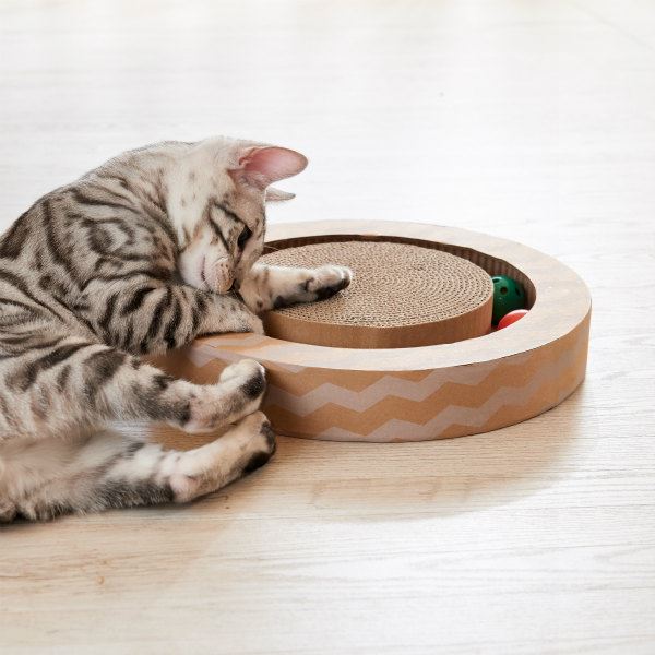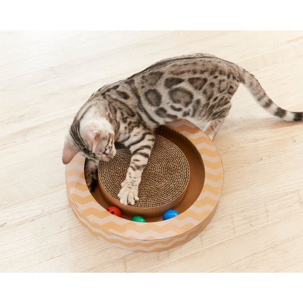 くるくるまわるボールに夢中、五感を刺激する爪とぎ付きおもちゃ