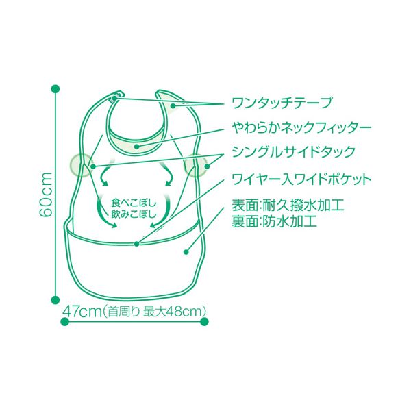 ●「ワイヤー入ワイドポケット付」のため、ポケットを広げたまま固定でき、食べこぼしをキャッチします。