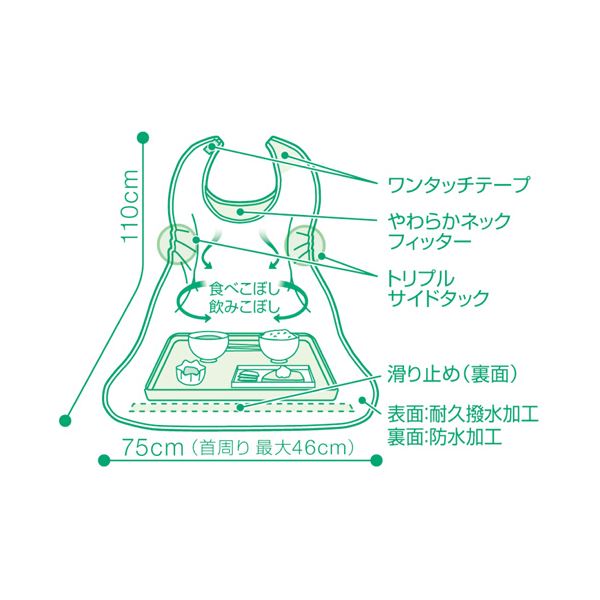 ●「トリプルサイドタック」がエプロンを内側に反らせ、食べこぼしの横モレを防ぎます。