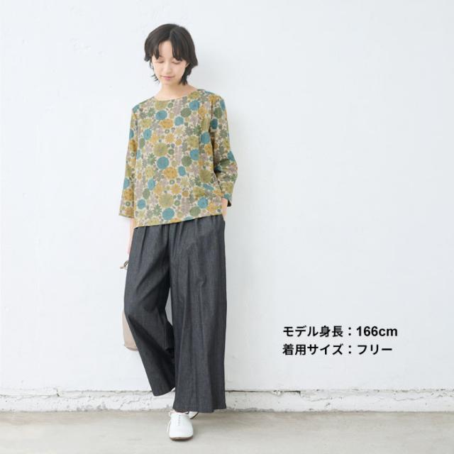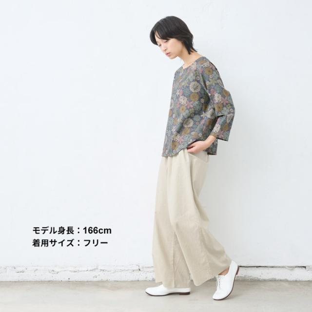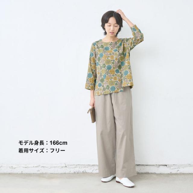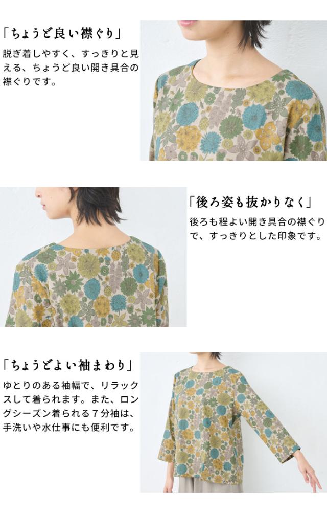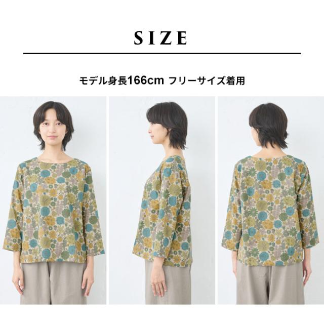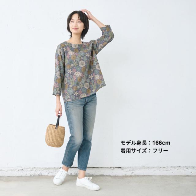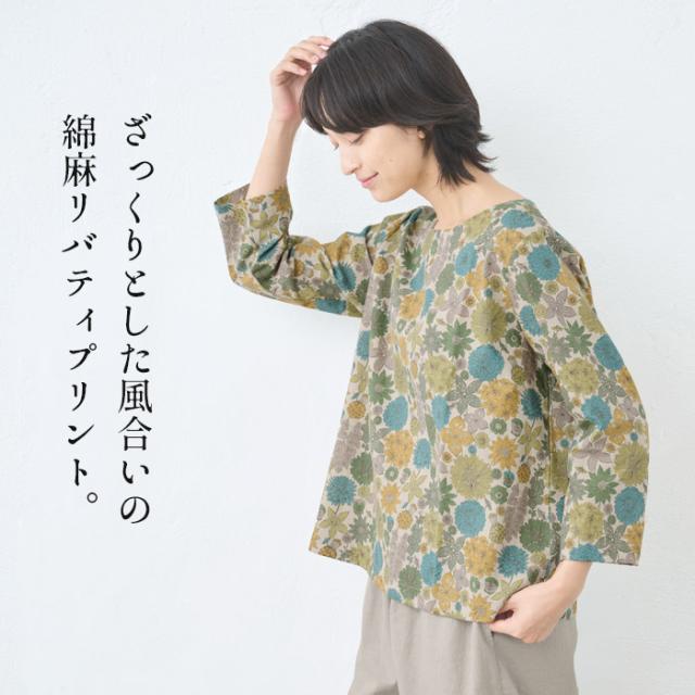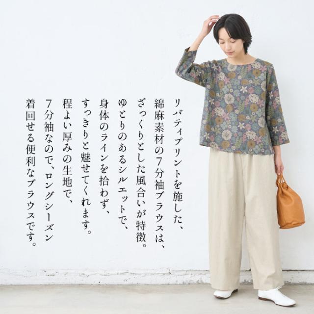 特徴 リバティプリントを施した、綿麻素材の7分袖ブラウスは、ざっくりとした風合いが特徴。ゆとりのあるシルエットで、身体のラインを拾わず、すっきりと魅せてくれます。程よい厚みの生地で、7分袖なので、ロングシーズン着回せる便利なブラウスです。