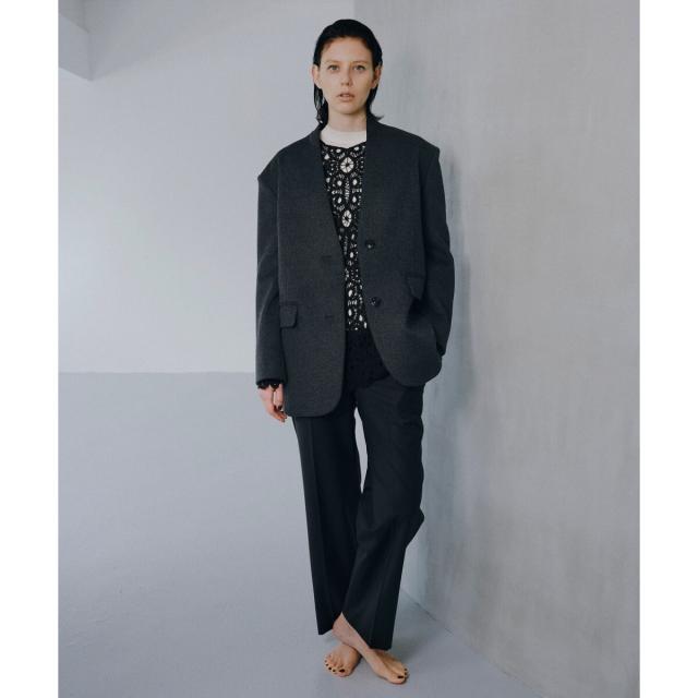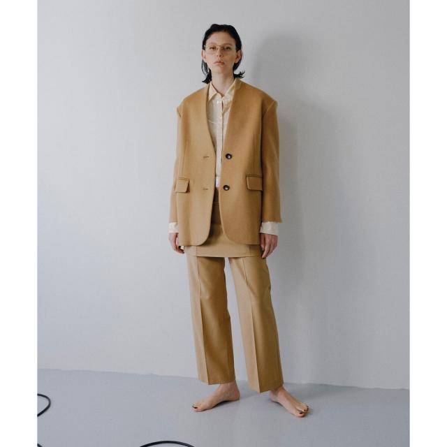 スラックスは、裾に向かってほんのりテーパードさせたシルエットで美脚効果あり。