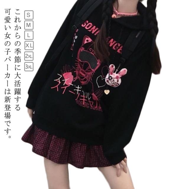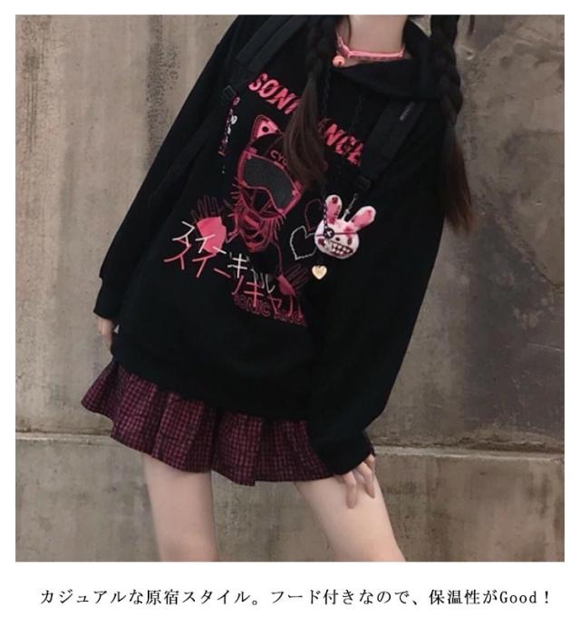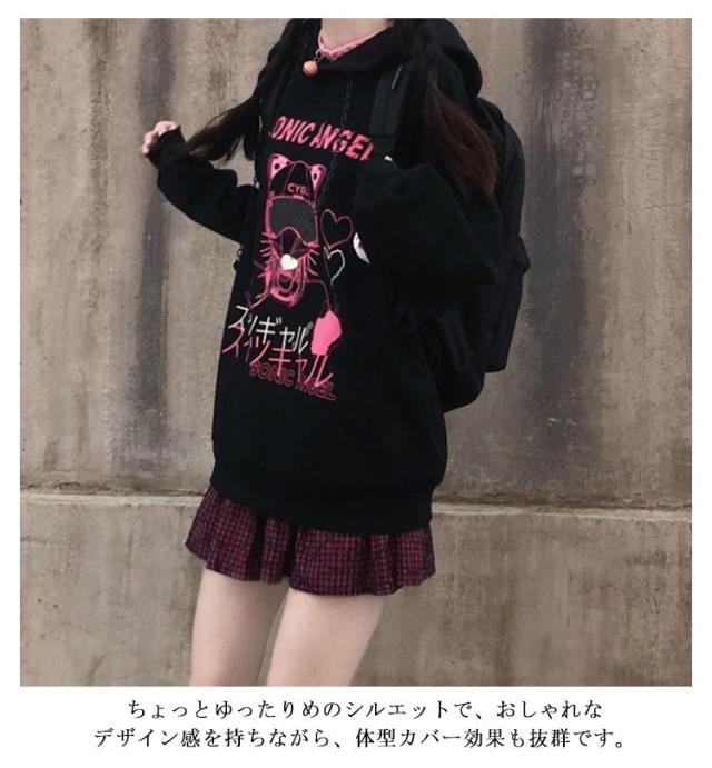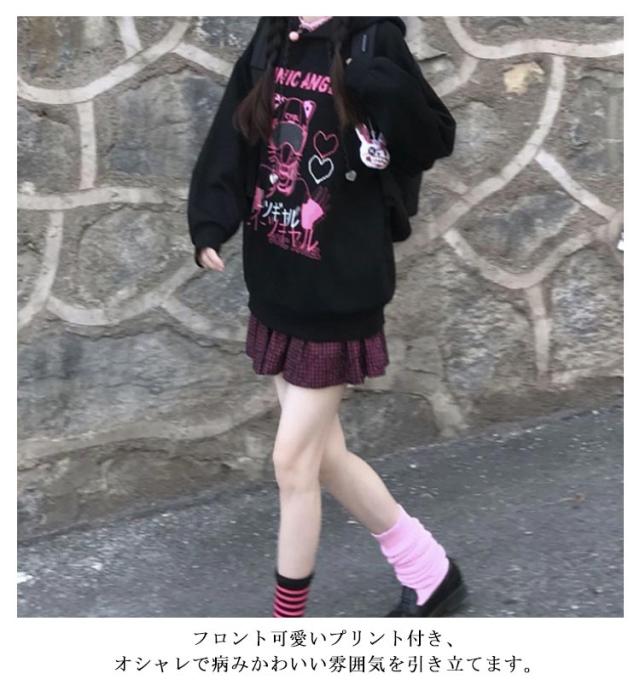 病みかわいい フード付き パーカー レディース ゆったり 長袖 スウェット サブカル系 地雷系 量産型 服 トレーナー プリント おしゃれ プルオーバーパーカー 韓国風 ファッション アウター 秋 冬 可愛い 通学 ストリート系 原宿風