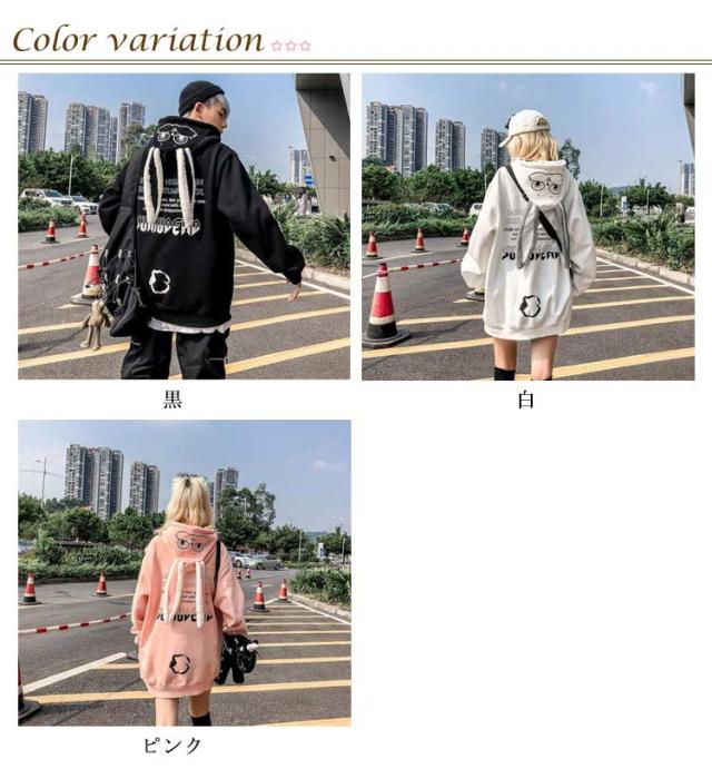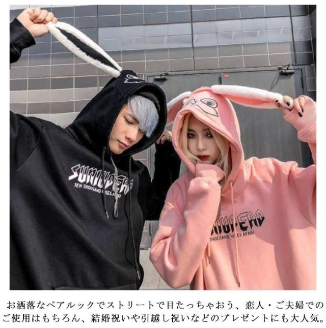 うさぎ耳 フード付き パーカー レディース メンズ オーバーサイズ トレーナー ゆったり スウェット 裏起毛 厚手 アウター プルオーバー トップス カジュアル 原宿系 ストリート系 おしゃれ 春 秋 冬 ペア カップル お揃い 彼氏 彼女 誕生日 プレゼント