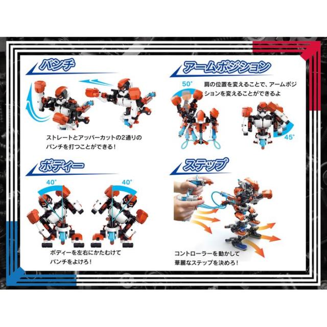 ボクサロイドは水圧パワーでパンチを繰りだすボクシングロボット。コントローラーの操作でパンチを打ったり、体をかたむけてパンチをよけたりといろいろな動きが可能。相手方のロボットの顔をパンチで倒せばノックアウト(K.O.)!多彩な動きを駆使してKOを狙おう!