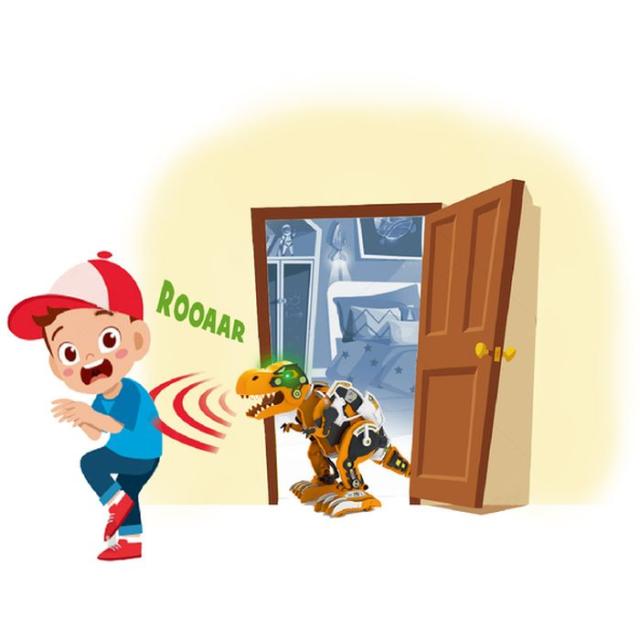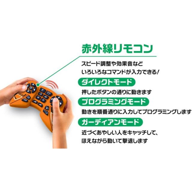 ロボレックスは、ガオーとほえてノシノシ歩く、恐竜ロボットキットです。付属の赤外線リモコンで、前進やバック、左右に曲がる、ガオーとほえるなどの操作ができます。3つのモードを搭載したド迫力のロボレックスを自在に動かそう!【1.ダイレクトモード】赤外線リモコンのボタンの通りにいろいろな動きをします。【2.プログラミングモード】歩行動作や効果音など、事前にプログラミングで順番に入力した通りの動きを実行します。【3.ガーディアンモード】搭載した動きセンサーで近づく人をキャッチすると、みはり番のようにほえながら動いて撃退します。