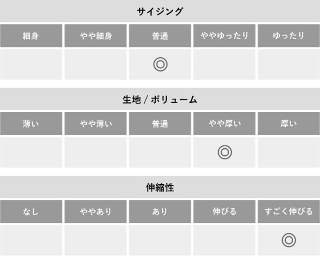 | 本体:ポリエステル90% ポリウレタン10% レイヤード部分:ポリエステル65% 綿35% |