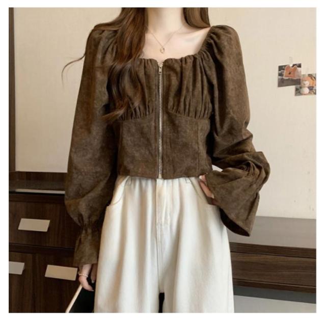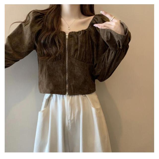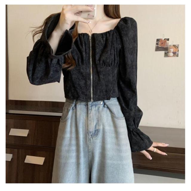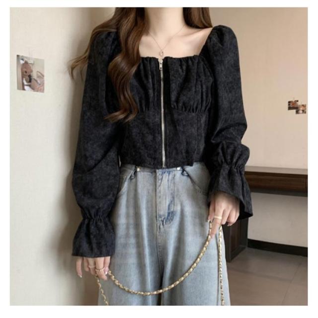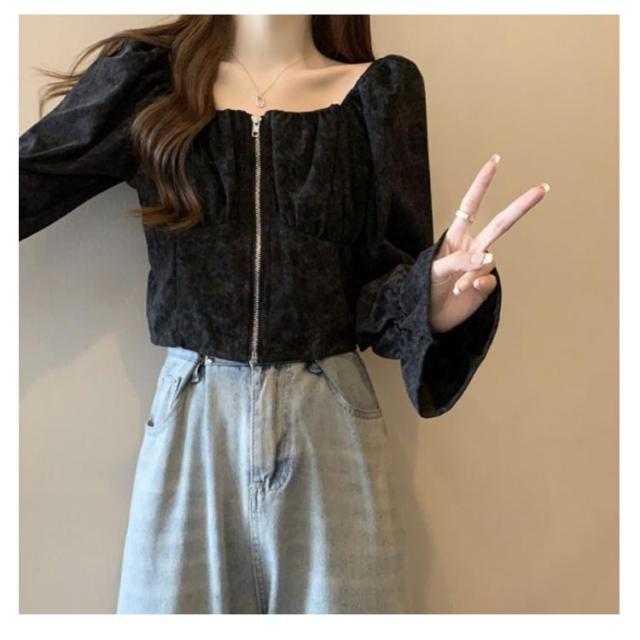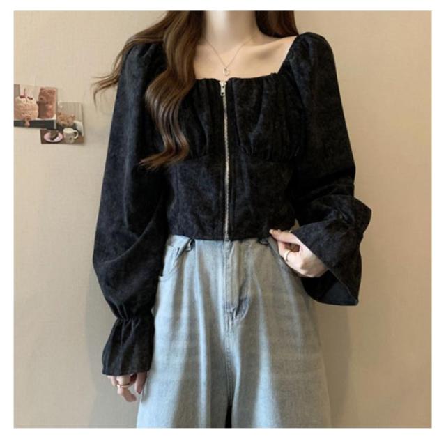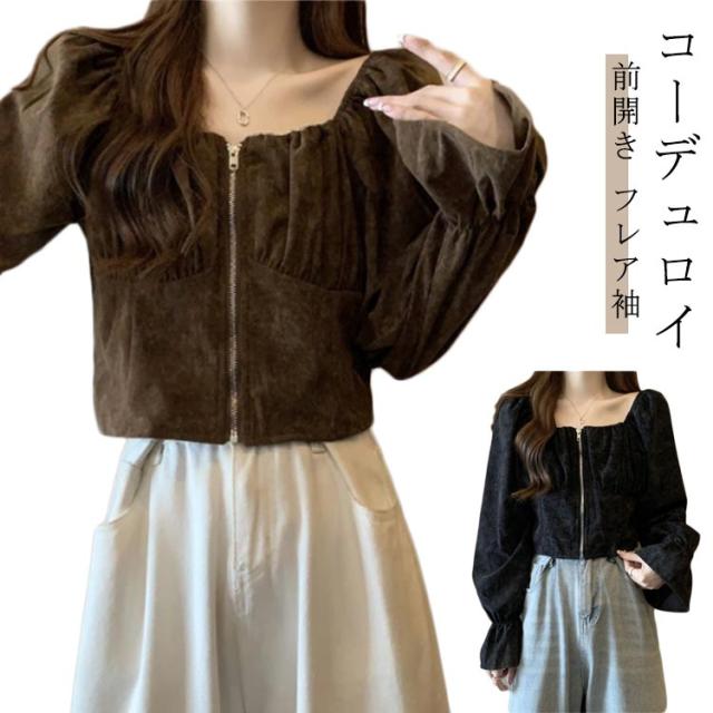 レディース レトロ 長袖 おしゃれ シャツ ショート トップス 前開き スクエアネック コーデュロイ 春 フレア袖 可愛い ガーリー フェミニン 着回し デート きれいめ 秋 S M L XL 2XL