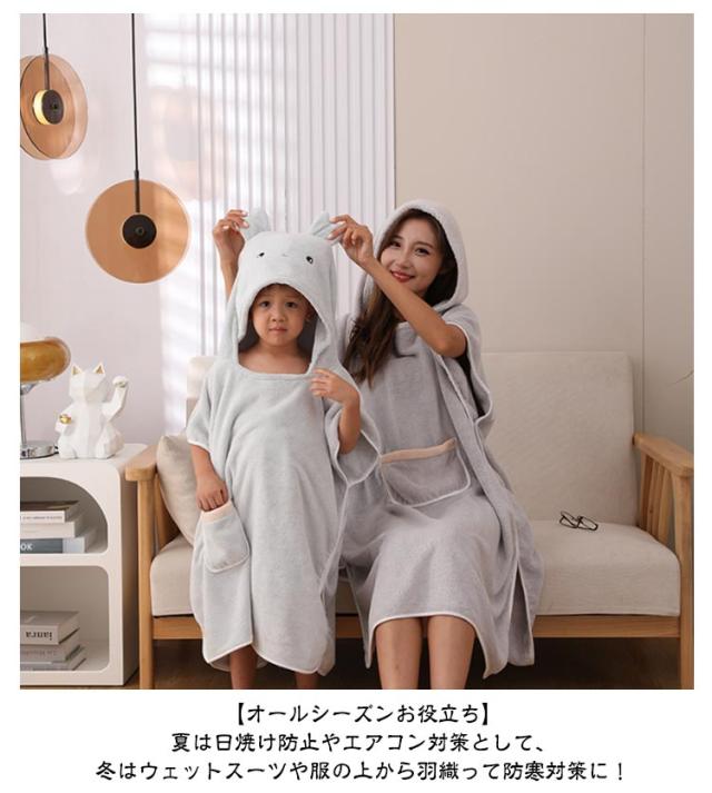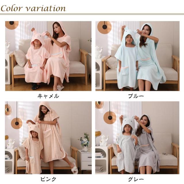 | 瞬間吸水 かわいいクマ耳付きフード♪ ふわふわ柔らか着るバスローブ 親子2点セット 【実用的&キュート】 サッと吸水するタオル地のバスポンチョはいそがしいママの強い味方! 【マシュマロみたいなやわらか素材】 赤ちゃんの肌にもやさしいマイクロファイバー素材を使用。繰り返し洗ってもソフト感を失わずずっと快適な柔らかさ。 【グングン水分を吸収】 お風呂上りや水遊び後にサッと羽織るたけでぬれた身体を素早く乾かしてくれる優れもの。湯冷め対策にもばっちり。 【機能性抜群】 ゆったり羽織れるサイズですが、胸元が気にならない作りになっています。 前面には、大きめのポケットがついているので、スマートフォンや鍵などを収納できて大変便利にご使用いただけます。 【オールシーズンお役立ち】 夏は日焼け防止やエアコン対策として、冬はウェットスーツや服の上から羽織って防寒対策に! またお風呂上りのワンオペママのバスローブや、サウナポンチョとしても使えてオールシーズンお役立ち間違いなしです。 | |