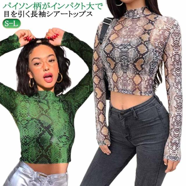 派手 パイソン柄 ダンス衣装 衣装トップス ダンス 長袖 韓国 ダンス 韓国ファッション ヒップホップ ストリート系 ファッション ハイネック 衣装 ダンス衣装 へそ出し ロンt セクシー かっこいい シースルー レディース 秋冬 グリーン ブラウン S M