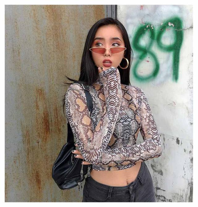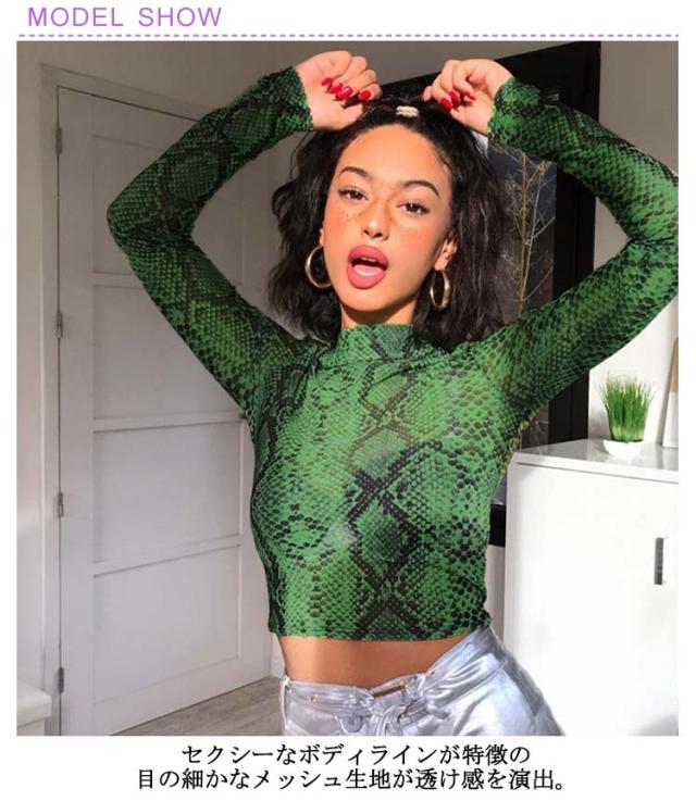 | S-L!パイソン柄がインパクト大で目を引く長袖シアートップス。 セクシーなボディラインが特徴の目の細かなメッシュ生地が透け感を演出。 クロップド丈デザインがトレンドライクな印象を与えてくれます。 | |