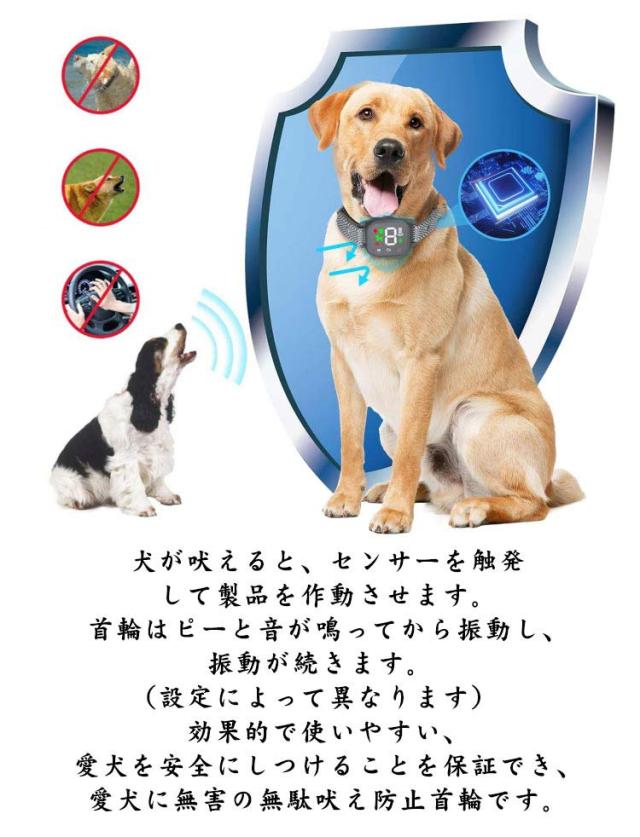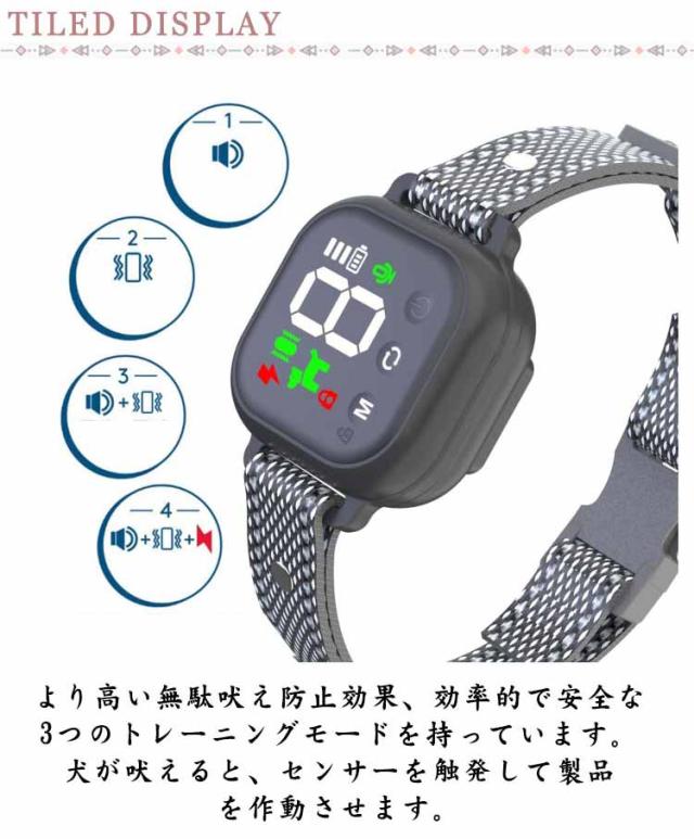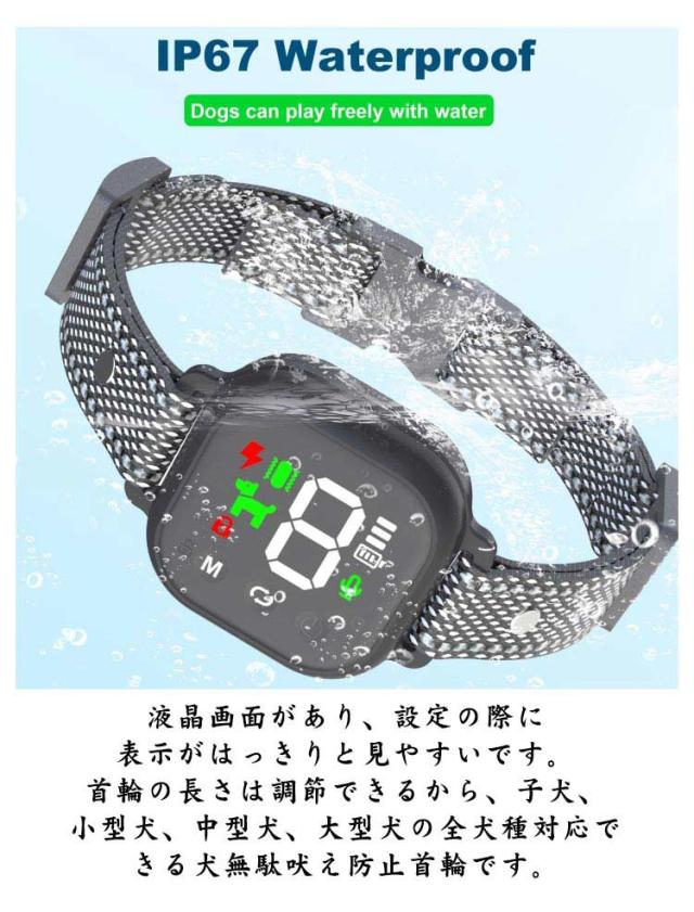 | ビープ音、振動、ビープ音&振動、ビープ音&振動&電気ショック 必要に合わせて4モード利用可能。 より高い無駄吠え防止効果、効率的で安全な3つのトレーニングモードを持っています。犬が吠えると、センサーを触発して製品を作動させます。 犬が吠えると、センサーを触発して製品を作動させます。首輪はピーと音が鳴ってから振動し、振動が続きます。 (設定によって異なります) 効果的で使いやすい、愛犬を安全にしつけることを保証でき、愛犬に無害の無駄吠え防止首輪です。 スマートセンサーを装備した無駄吠え防止首輪は、犬の首振り、他の犬の鳴き声、その他騒音などを検出し、他の音や他の犬による誤った刺激がなくなり、誤動作ゼロ。 わずか2 時間で充電され、約 15 日間使用できます。IP67 レベルの防水犬用首輪は、どんな天候でも屋外で使用できます。海などで水遊びしても安全安心。 液晶画面があり、設定の際に表示がはっきりと見やすいです。 首輪の長さは調節できるから、子犬、小型犬、中型犬、大型犬の全犬種対応できる犬無駄吠え防止首輪です。 | |