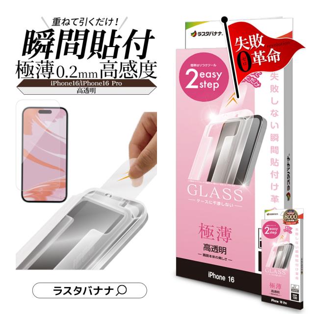 iPhone16 16 Pro 15 ガラスフィルム 平面保護 高光沢 クリア 傷に強い 干渉しない 貼付革命 瞬間貼り 薄型 高感度 0.2mm ラスタバナナ