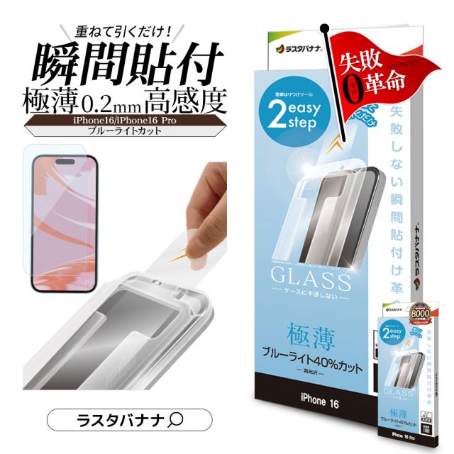iPhone16 16 Pro 15 ガラスフィルム 平面保護 ブルーライトカット 高光沢 傷に強い 貼付革命 瞬間貼り 薄型 極薄 0.2mm ラスタバナナ