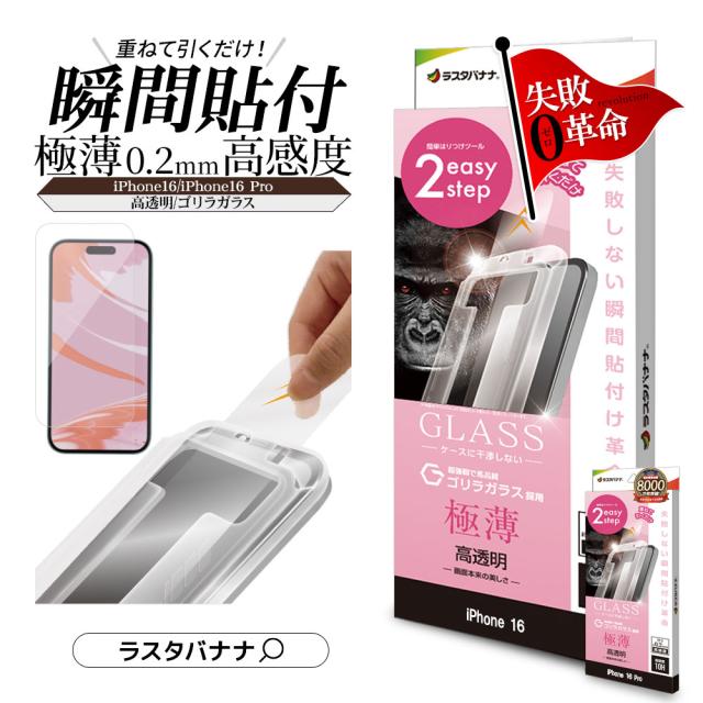 iPhone16 16 Pro 15 ガラスフィルム 平面保護 高光沢 クリア 傷に強い 貼付革命 瞬間貼り 薄型 高感度 0.2mm ゴリラガラス ラスタバナナ
