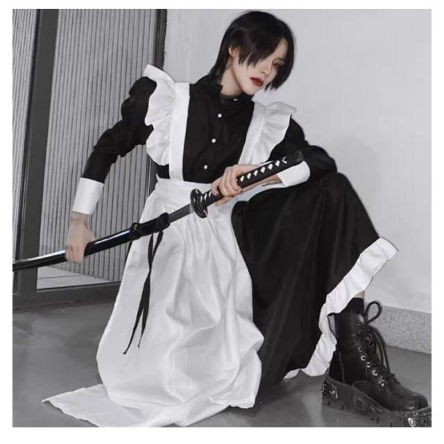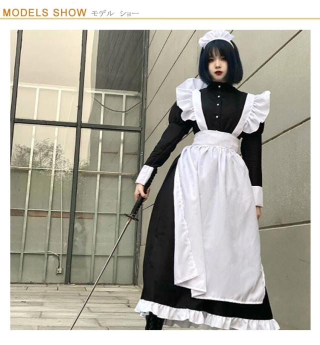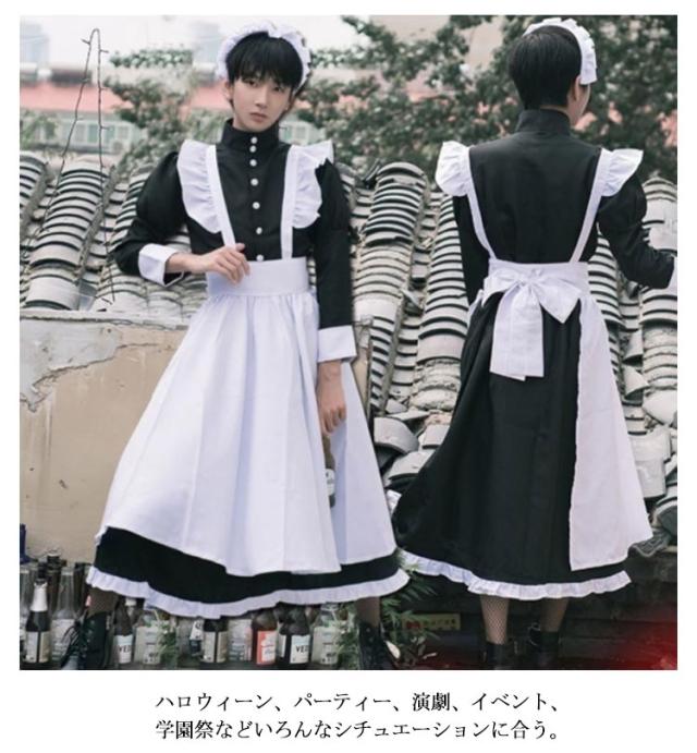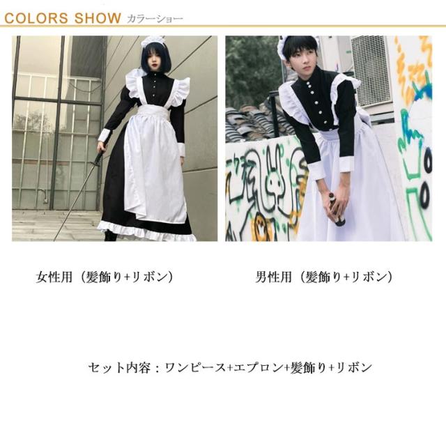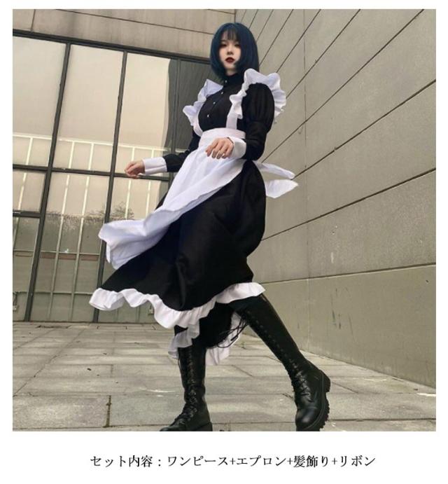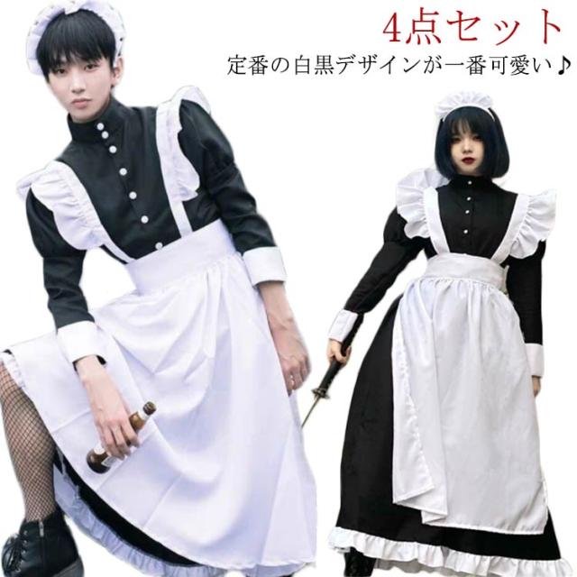 ロング丈 送料無料 ハロウィン 長袖 ワンピースタイプ 男性可 かわいい エプロン 4点セット カチューシャ コスプレ 大人 ロリータ 仮装 女装 女子 コスチューム 衣装 男子 送料無料 大きいサイズ リボン カフェ イベント 学園祭 文化祭 おしゃれ
