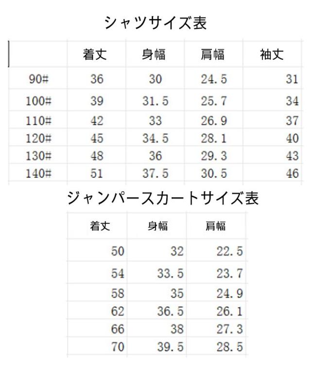 | サイズについての説明 | 2点セット内容:シャツ+ジャンパースカート ※サイズ表の実寸法は商品によって1-3cm程度の誤差がある場合がございます。 |