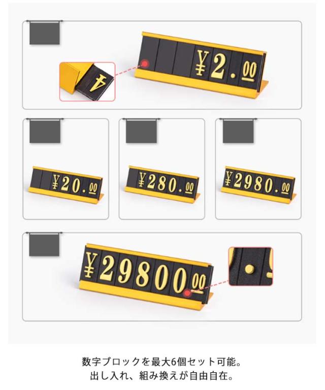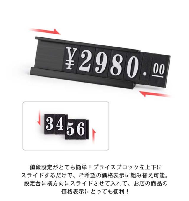 | プライスブロック×19+台座×16 たくさん入って便利 上品な光沢があり高級感のあるデザインがおしゃれで豪華なお店の雰囲気作りに活躍してくれます。 値段設定がとても簡単!プライスブロックを上下にスライドするだけで、ご希望の価格表示に組み替え可能。設定台に横方向にスライドさせて入れて、お店の商品の価格表示にとっても便利! コンパクトなのに一目で認識しやすい配色です。数字が見やすいからお客様にも優しいプライス表示です。 数字ブロックを最大6個セット可能。出し入れ、組み換えが自由自在。 便利なケース入りで紛失の心配がありません。 店舗、百貨店、フリマ、展示会、自宅サロン、商品カタログの撮影など様々なシーンに大活躍する値札プレートです。 | |