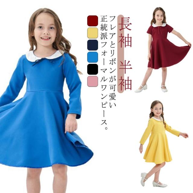 | フレアとリボンが可愛い正統派フォーマルワンピース。 白襟がアクセントに卒園式や入学式、発表会や結婚式など1枚OK。 シンプルを極めた着心地楽々なワンピースは、法事など喪服のようなきちんと感が出るブラック色も含めて全6色展開。 お出かけや写真撮影だけでなく、学校でも着ることができるし、さまざまな場合で活躍! 入園式、入学式、卒業式、卒園式、ピアノ発表会、結婚式、パーティー、七五三にもぴったり♪ | |