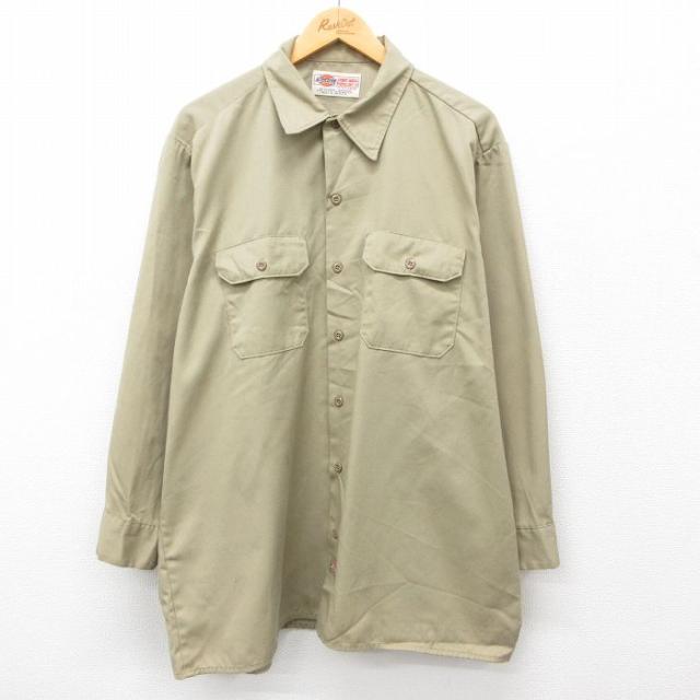 古着 ディッキーズ Dickies 長袖 ワーク シャツ メンズ 90年代 90s 大きいサイズ ロング丈 USA製 ベージュ カーキ XLサイズ 中 中古 古着