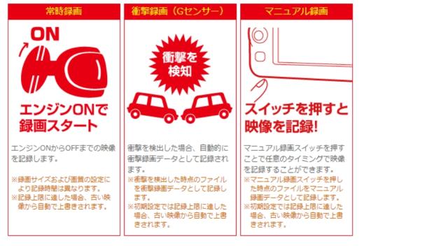 記録方式:常時録画/イベント録画(衝撃録画/マニュアル録画「手動録画」/後続車接近録画)