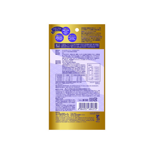 ラム肉(仔羊)、脱脂大豆、糖類、じゃがいも(遺伝子組換えでない)、植物油脂、大豆たん白、タピオカでん粉、ビール酵母、酵母エキス、マグロエキス(DHA、EPA含有)、セレン含有酵母、グリセリン、ミネラル類(カルシウム、リン、ナトリウム、亜鉛、鉄、銅、ヨウ素)、ソルビトール、天然着色料(クチナシ色素、カラメル)、リン酸塩(Na、K)、塩化コリン、食物繊維(グルコマンナン)、ビタミン類(A、B1、B2、B12、D3、E)