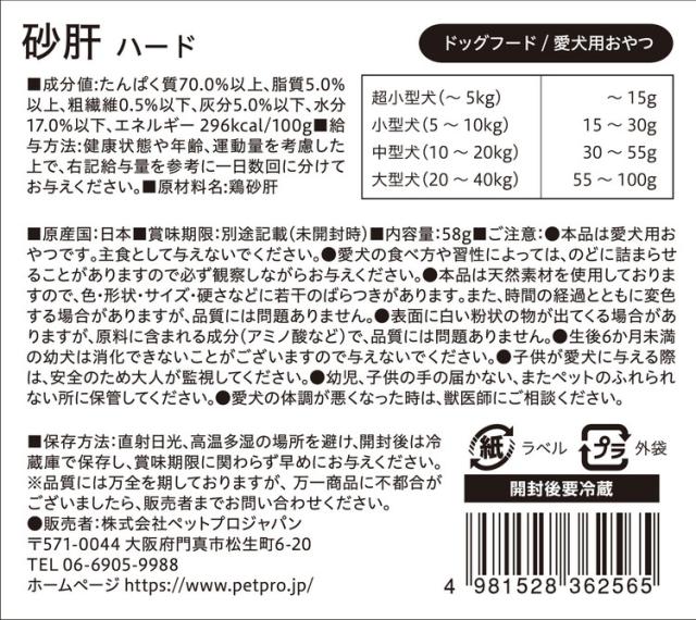 【3個セット】 ペットプロ 国産おやつ 砂肝ハード 58g 国産 日本製 犬用 犬 おやつ スナック ジャーキー 砂肝