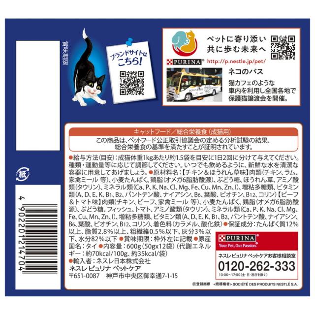 肉類(チキン、ビーフ、家禽ミール 等)、小麦たんぱく、鶏脂(オメガ6脂肪酸源)、ぶどう糖、フィッシュ、トマト、アミノ酸類(タウリン)、ミネラル類(Ca、P、K、Na、Cl、Mg、Fe、Cu、Mn、Zn、I)、増粘多糖類、ビタミン類(A、D、E、K、B1、B2、パントテン酸、ナイアシン、B6、葉酸、ビオチン、B12、コリン)、着色料(カラメル、酸化鉄)