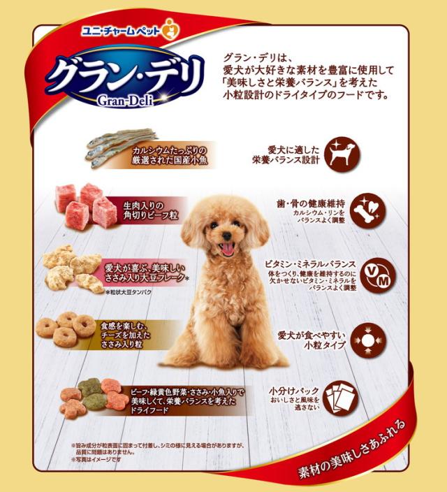 グラン・デリは、愛犬が大好きな素材を豊富に使用して「美味しさと栄養バランス」を考えた小粒設計のドライタイプのフードです。