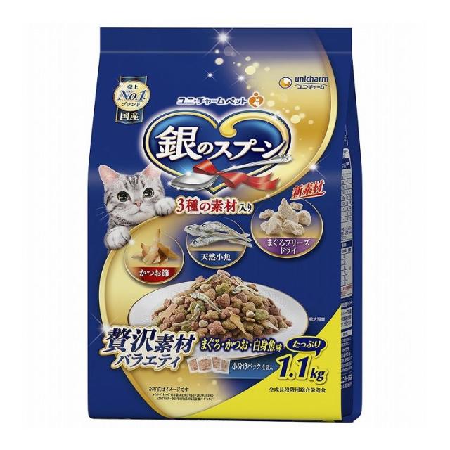 【4個セット】 ユニチャーム 銀のスプーン 贅沢素材バラエティ まぐろ・かつお・白身魚味 1.1kg【送料無料】