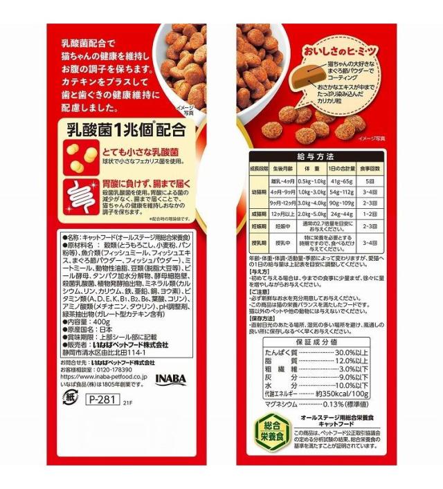 穀類(とうもろこし、小麦粉、パン粉等)、魚介類(フィッシュミール、フィッシュエキス、まぐろ節パウダー、フィッシュパウダー)、ミートミール、動物性油脂、豆類(脱脂大豆等)、ビール酵母、タンパク加水分解物、酵母細胞壁、殺菌乳酸菌、植物発酵抽出物、ミネラル類(カルシウム、リン、カリウム、鉄、亜鉛、銅、ヨウ素)、ビタミン類(A、D、E、K、B1、B2、B6、葉酸、コリン)、アミノ酸類(メチオニン、タウリン)、pH調整剤、緑茶抽出物(ガレート型カテキン含有)
