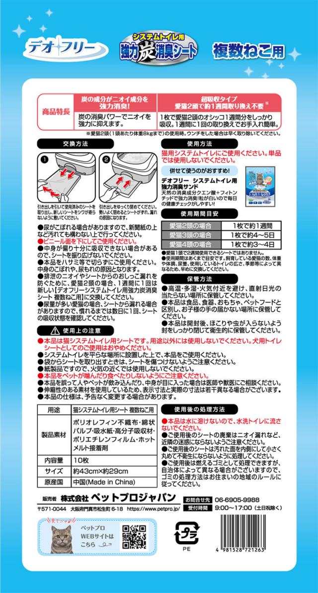【2個セット】 ペットプロ デオフリー 強力消臭シート 複数ねこ用 10枚 各社共通 システムトイレ用シート 猫シート 猫用シート 猫用トイレシート シーツ PetPro【送料無料】
