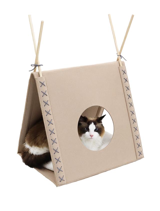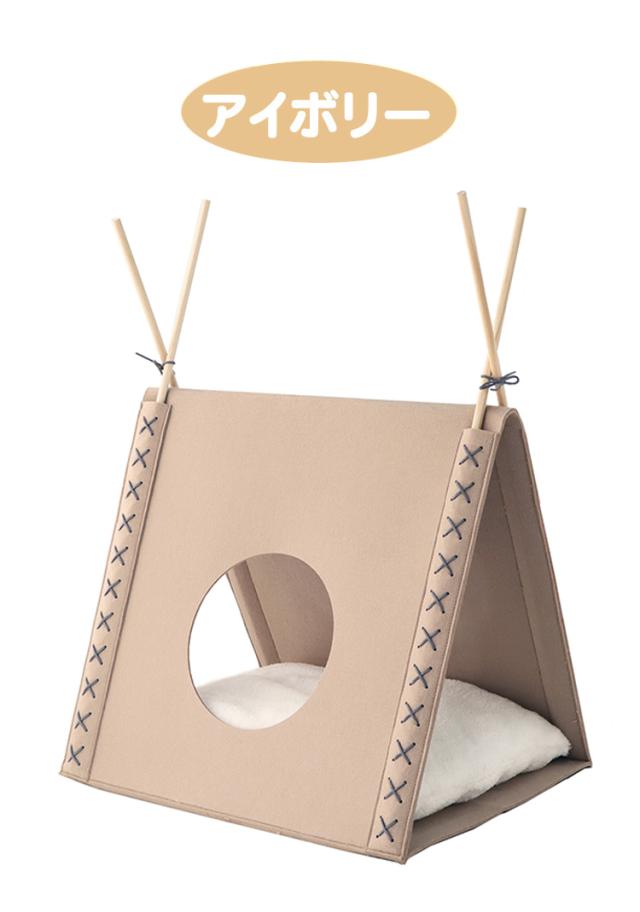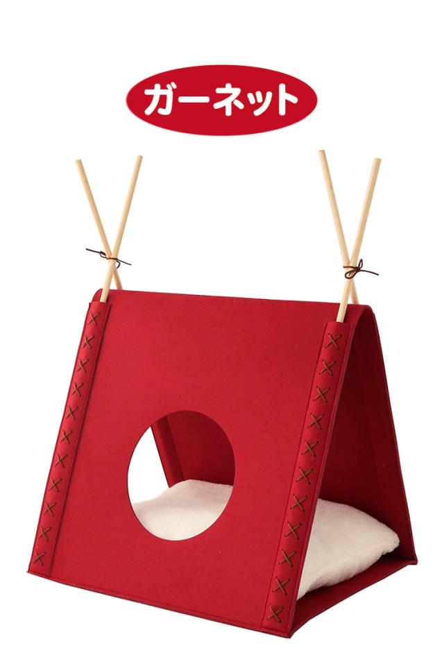 柔らかいフェルト生地仕上げ。天然木のポールがアクセント、さんかく屋根にφ20cmの遊び穴、入り口も付いています。天井が高く広々空間。350×450mmボアクッション付。