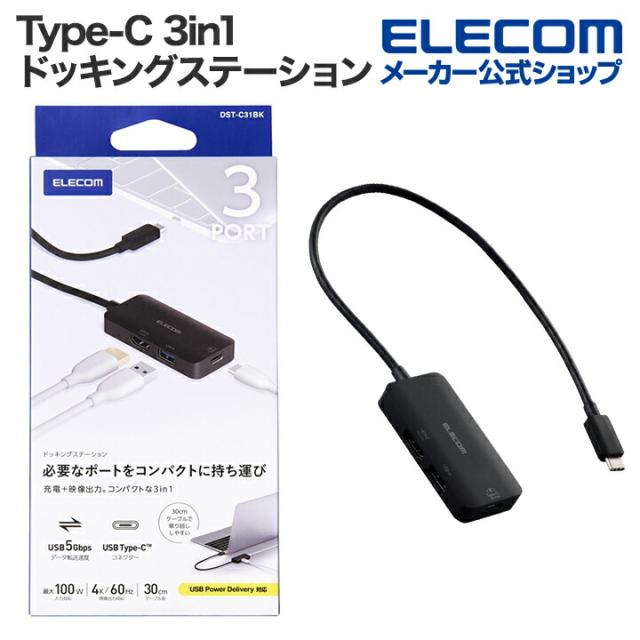 エレコム Type-C ドッキングステーション 3in1 充電 + 映像出力 USB-C×1 USB-A×1 HDMI×1 type-c ブラック ┃DST-C31BK
